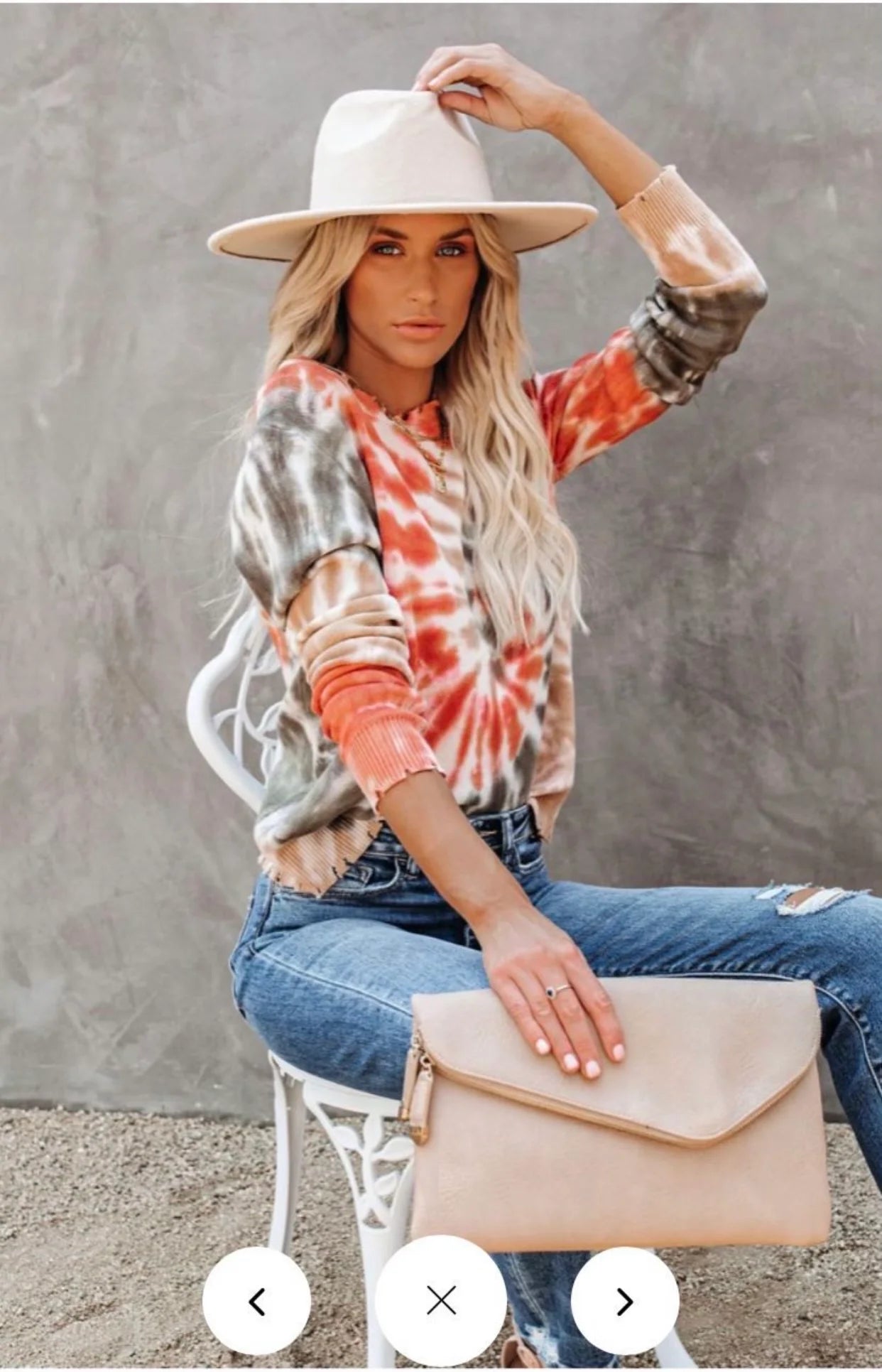 The After The Storm Sweater features a distressed hem and a round neckline, combining edgy style with comfort. Its warm color hues and tie-dye pattern create a unique, inviting look, while the roomy fit ensures ease of movement and layering. Perfect for those seeking a bold yet cozy addition to their wardrobe.