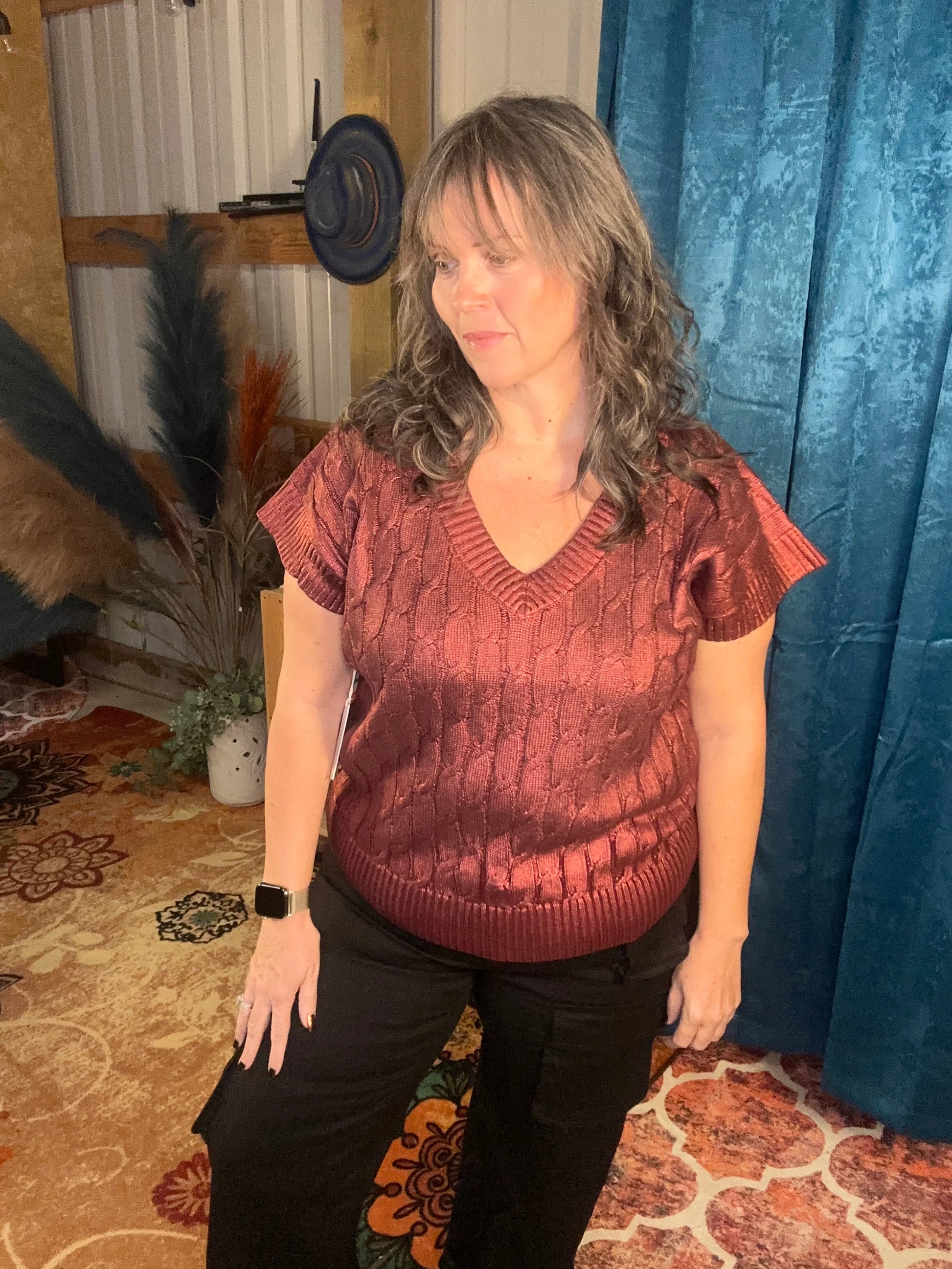 Elevate your wardrobe with the Bay Top, featuring a striking crimson red hue enhanced by metallic foil detailing for a subtle shimmer. Designed with a flattering V-neck and short sleeves, this versatile piece is ideal for year-round wear. Its festive appeal makes it a perfect choice for holiday gatherings, combining comfort and style effortlessly.