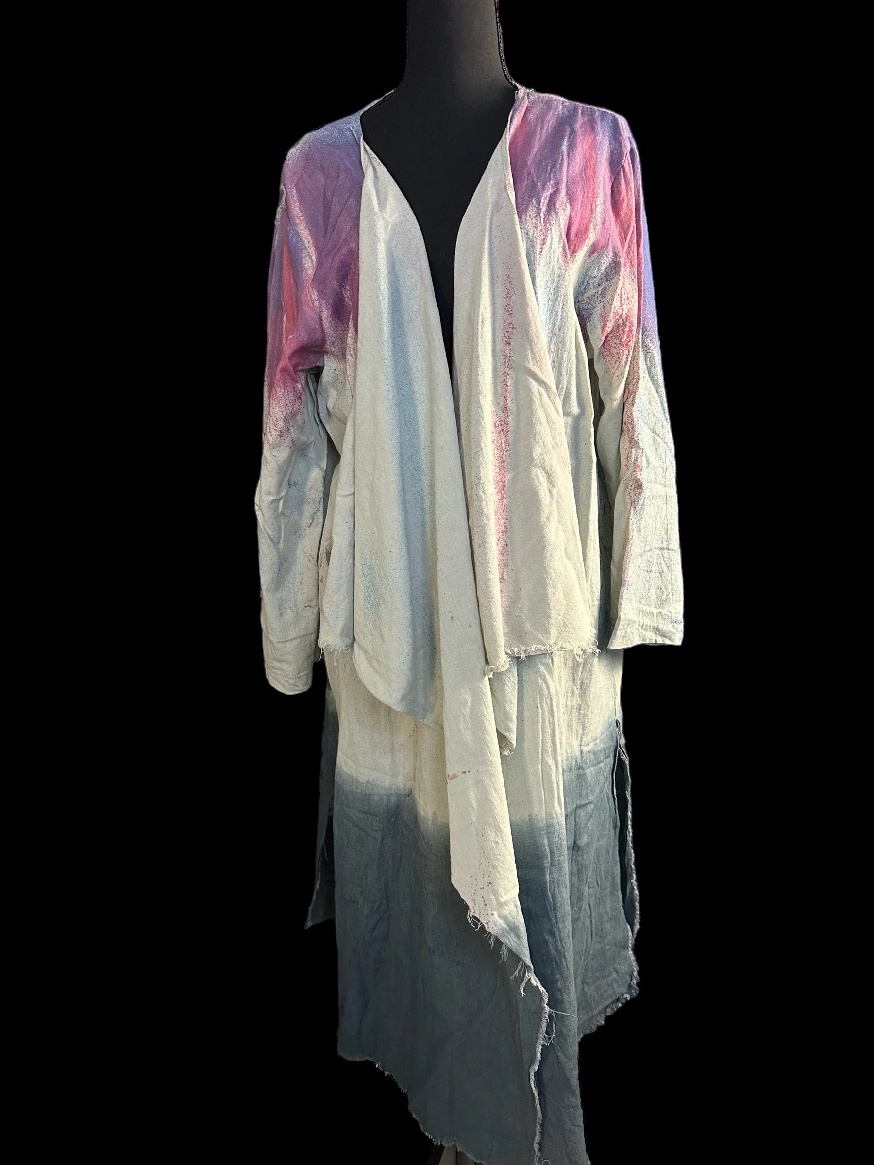 Introducing the Dragonfly Duster—a wearable work of art that'll have everyone asking where you found it! Crafted from soft cotton and designed by A Rare Bird, this stunning piece features hand-drawn dragonfly artwork with shimmering rhinestones that catch the light beautifully. The back is hand-dipped dyed in gorgeous purples, light greys, and pewter tones, creating a one-of-a-kind watercolor effect. Love versatility? The sleeves transform from full length to 3/4 with functional buttons to keep them exactly where you want them. With intricate details throughout, this duster is basically a compliment magnet waiting to happen.