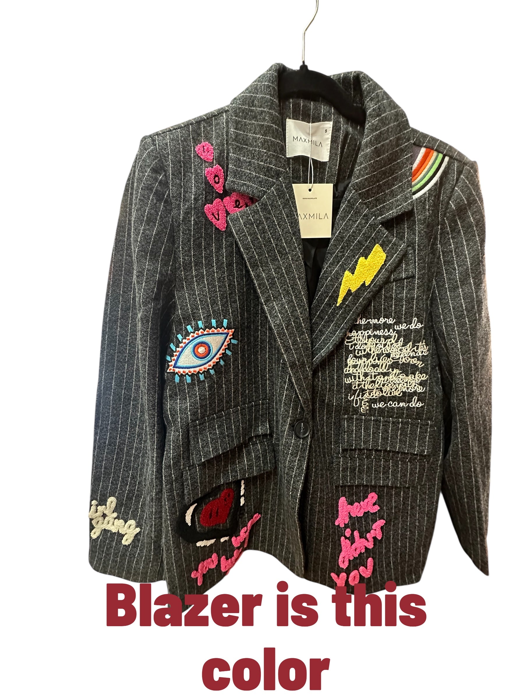 Elevate your wardrobe with this expertly crafted Funky Embroidered Blazer, featuring intricate all-over embroidered artwork on the front and sleeves. The subtle pinstripe design and anthracite color offer a refined dark grey tone perfect for versatile styling. Faux front pockets and a fully lined interior provide structure and comfort. A piece made in Paris that transitions seamlessly from casual paired with a graphic tee to polished when worn with a button-down blouse.