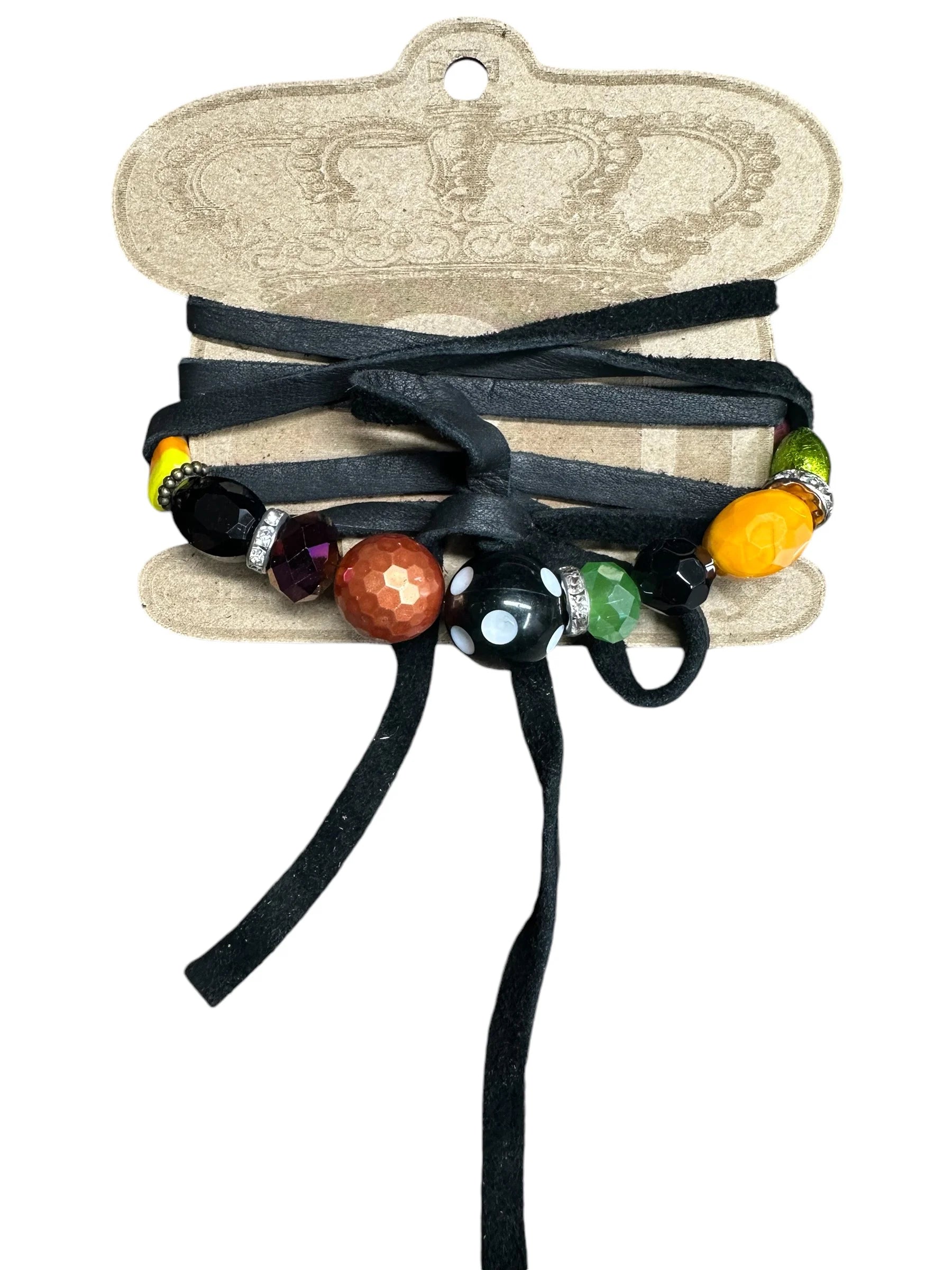 The Halloween wraps are da BOMB! These can be worn as : choker, necklace, wrist wrap, arm wrap, boot wrap, hat band and a belt! These multi purpose goodies are the best pops of Halloween colors (my fave)!!!! The strung middle piece will vary with Halloween goodies, but the long super soft deer leather will measure approx. 75 to 85 inches!