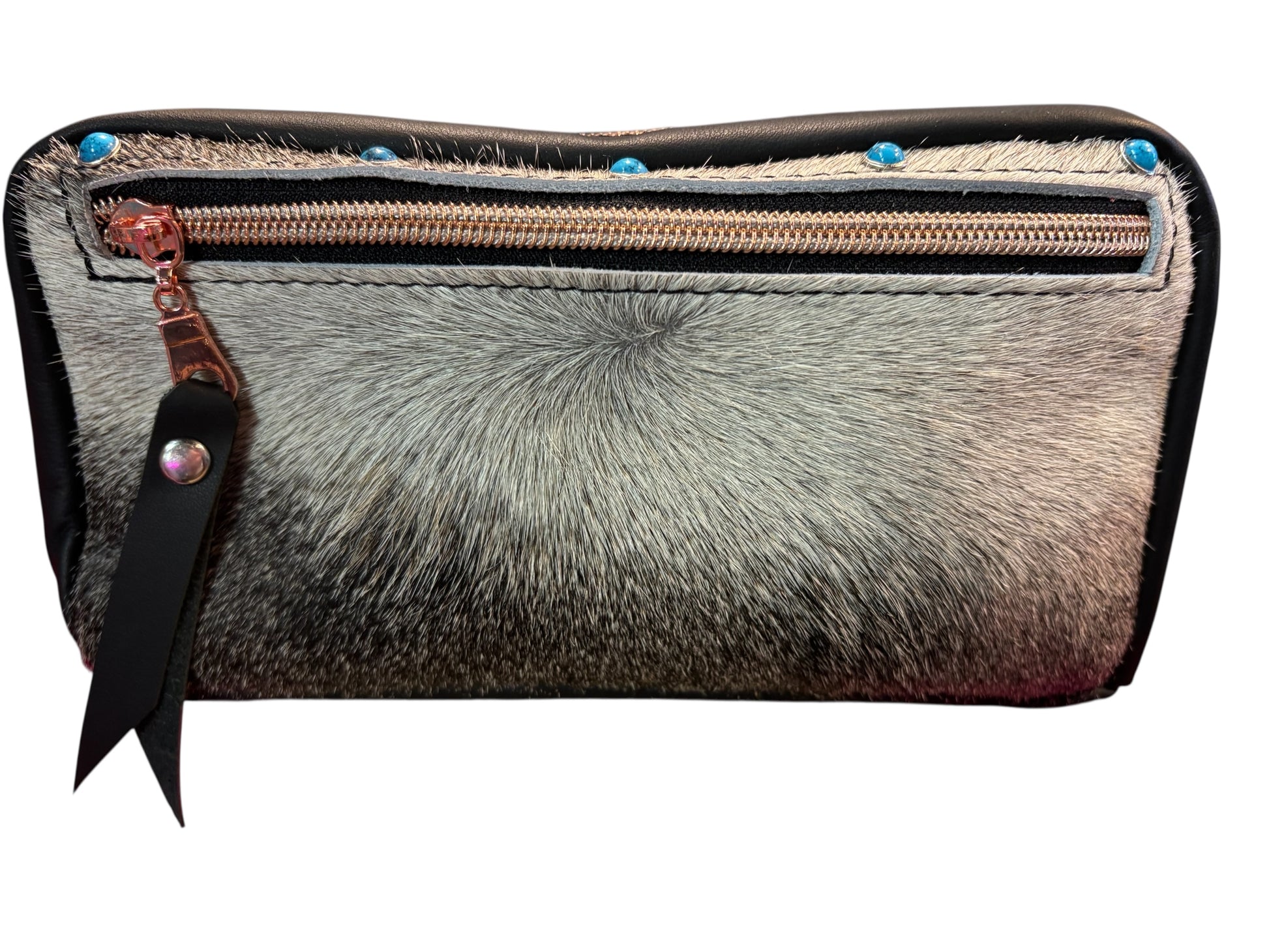 The Meets the West Crossbody Leather Bag features a smooth black leather body paired with an ombré hair-on-cowhide front panel, providing a bold yet refined aesthetic. Accented with turquoise rivet detailing, this genuine leather bag offers a front zip pocket for secure storage and an adjustable leather strap for a customized fit. Handmade and one of a kind, it exemplifies expert craftsmanship and timeless style.