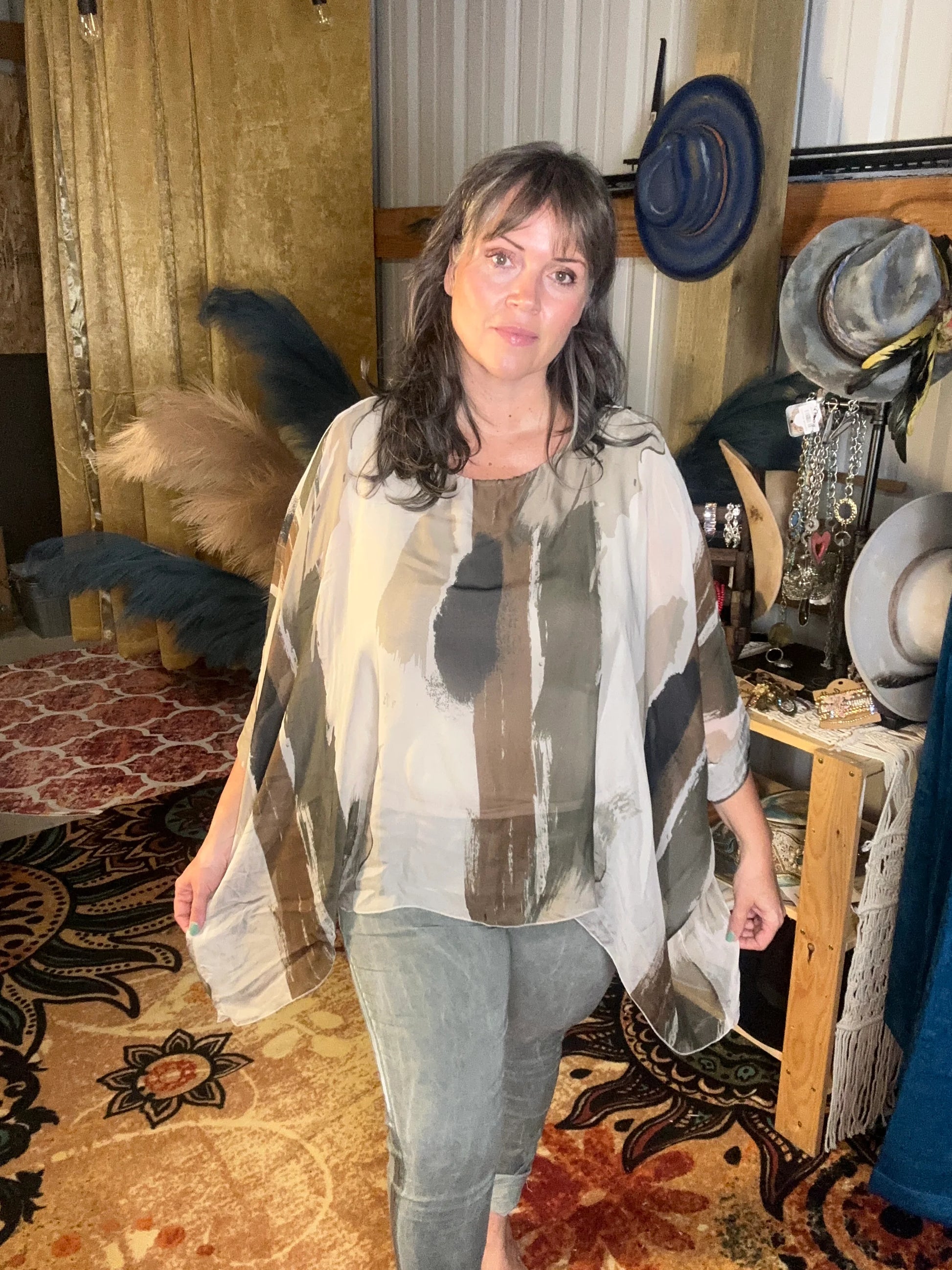 This top is a flowy OS top and is giving us Rich Aunt Vibes. We are loving how this top will fit sizes 4-14 Comfortably.