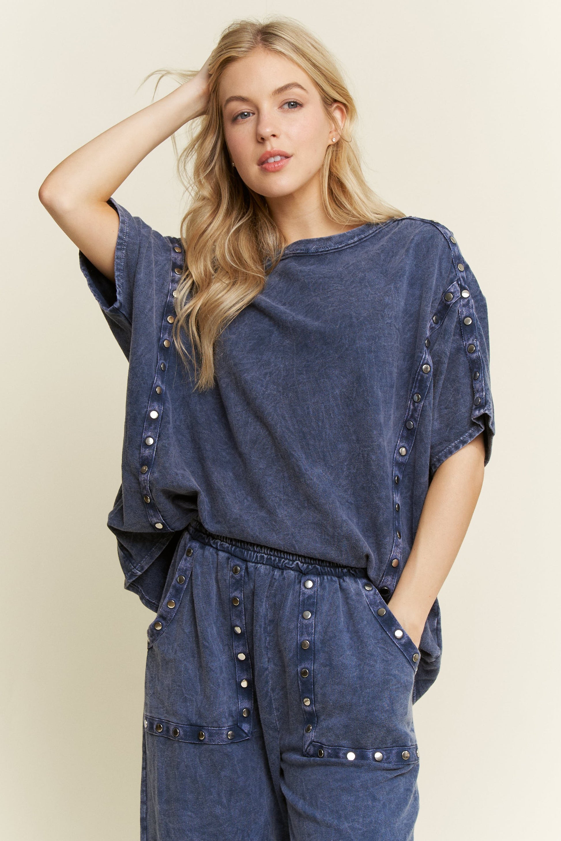 Experience effortless style and comfort with the Relax in Stud Set by J.Her. Crafted from 100% mineral-washed cotton, this soft, relaxed-fit top features subtle stud detailing for a refined touch. Designed to pair seamlessly with coordinating pants, it offers a versatile option for casual or polished looks while ensuring breathable comfort throughout the day.