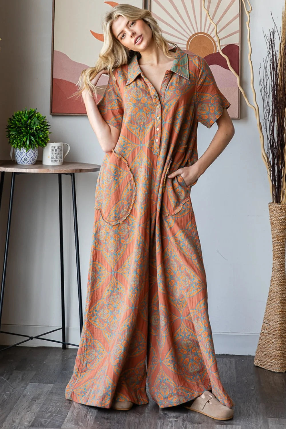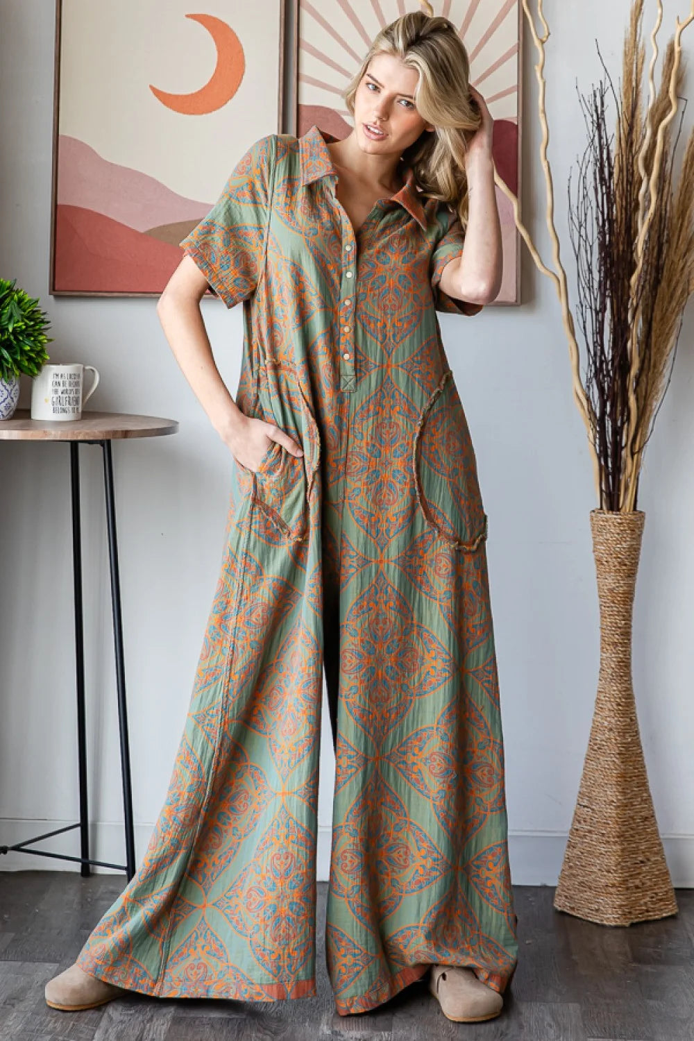 In LOVE with this Reversible Jumpsuit by Oli & Hali. It features snap buttons for easy on & off access, A V-neck and a fantastic collar that can be flipped either way. Nice roomie pockets for all your goodies, which is a bonus! And Best part is; This jumpsuit is so comfortable and stylish with wide legs. You are going to look so cute this season in this piece. Pair it back with your favorite Wedges, Boots, Sneakers, or Platform Sandals. Then grab your favorite Denim Jacket, Duster, or Cardi and be prepared for all The compliments you are going to receive!