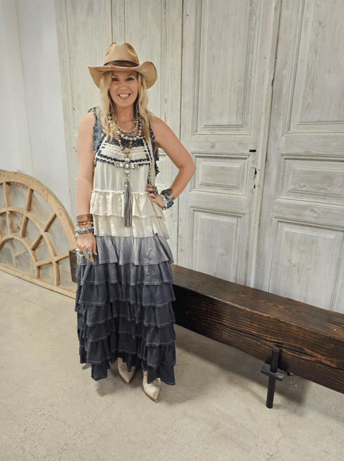 Ombre ruffles enhanced by a full Ric Rac bodice is a keeper! Ties in the back to cinch if needed but this dress is so very slimming! Stunning with fun ric rac ties to adjust.
