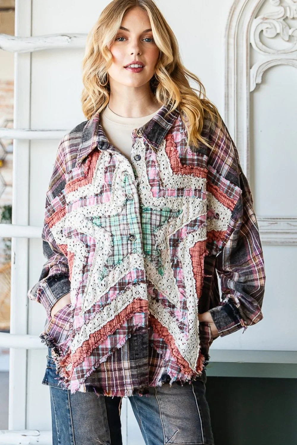 Ladies, this flannel top is a button down, washed look, with a raw edge hemline. It features an amazing quilted/applique star that is layered with more stars. This is GOING To Be On ROTATION in our Closet and Yours this Fall and Winter! We are definitely going to be elevated our look in this top. Wear it as a top or a Shaket with all of your fabulous under layering pieces.