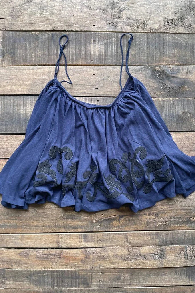 This navy blue Tank top, by Jaded Gypsy, features adjustable spaghetti straps. This handmade top has plenty of material giving it the perfect silhouette for a flowy, loose fit, look. Wear this top by itself while you soak up the sun or wear it as an under layering piece as the weather cools down. Either way, you just found your new, favorite, go to piece.